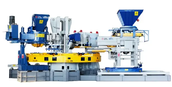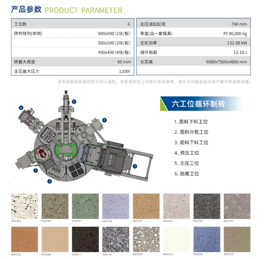 Staattinen HP-1200T pyörivä pöytäpuristin jakaa luovasti tiilenvalmistusprosessin 7 asemaan, jotka on järjestetty pyöreästi, mikä vähentää lattiatilaa, ja sillä on suuri muottipinta-ala ja muottikorkeusalue, mikä varmistaa, että asiakkaiden monipuoliset vaatimukset kivibetoniharkkojen jäljitelmätuotteille täyttyvät. Sen muotoiltu ryhmästandardi "T/CCMA 0125-2022 Rotary Multi-station Static Press Concrete Block Forming Machine" on valittu yhdeksi teollisuus- ja tietotekniikan ministeriön 100 ryhmästandardisovelluksen esittelyprojektista vuonna 2023.